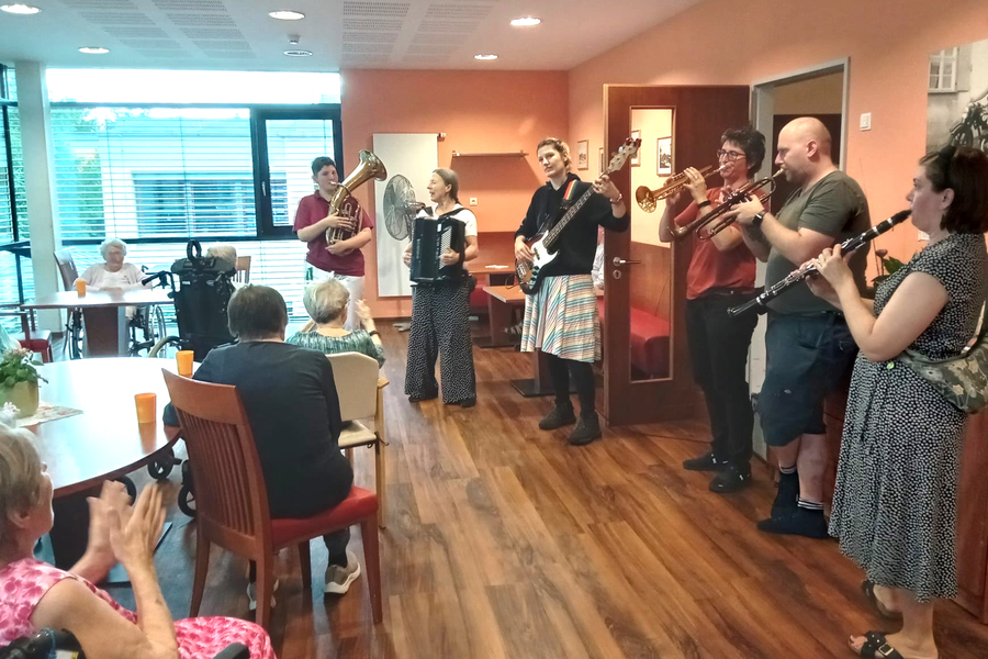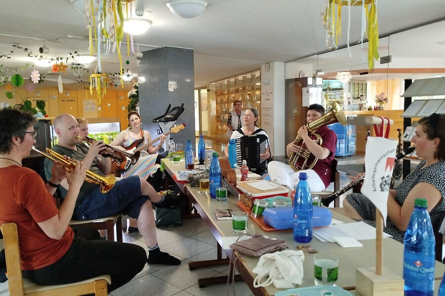 Musikantinnen und Musikanten treffen sich für gewöhnlich im Wirtshaus zum Stammtisch, diesmal war der Ort ungewöhnlicher: Als Mitarbeiterin des Fritz-Rupprecht-Heims konnte die Hornistin Emma Schmitzer die dortige Café-Betreiberin für ein ZamSpieln begeistern und so traf sich ein buntes Häufchen mit Instrumenten dort zu spendiertem Kaffee und Kuchen. Die Hausbewohnenden fanden das äußerst unterhaltsam und so war der Samstag Nachmittag für alle ein Gewinn. Die geschützte Station wurde mit einem extra Ständchen bedacht.