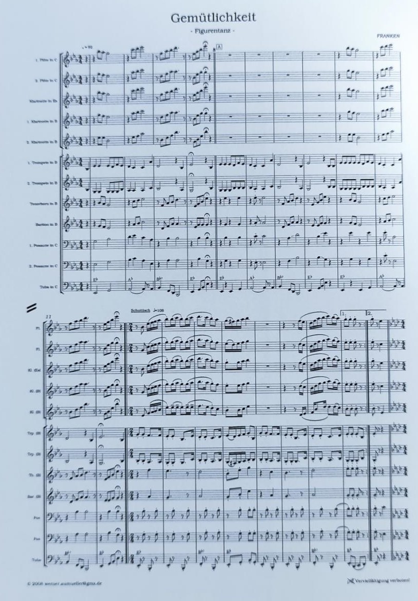Besetzung: 1. und 2. Flöte in C // Klarinette in Es // 1. und 2. Klarinette in B // 1. und 2. Trompete in B // Tenorhorn in B // Bariton in B // 1.. und 2. Posaune in C // Tuba in C // Direktion mit Akkordangaben für Begleitinstrumente
